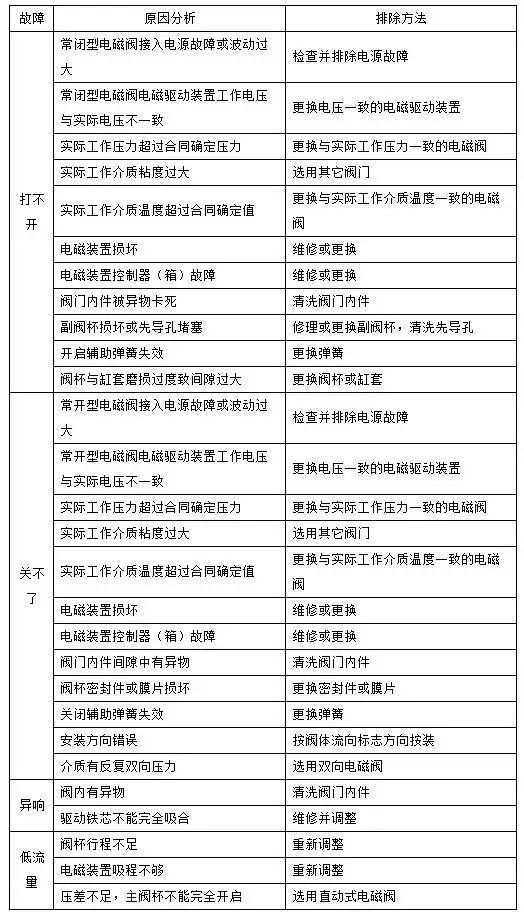 电磁阀因其特有的结构形式和工作原理,显著区别于其它阀门,它对使用介质类别、温度、工作压力特别是压差有着明确的要求,致使电磁阀内部零件配合要求更加精密,也因此,电磁阀发生故障的特点也明显区别。